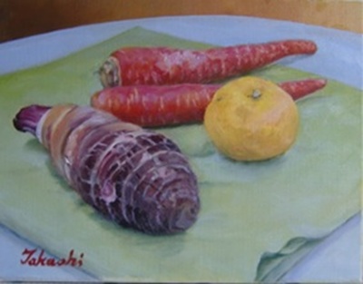 珍しい芋京芋と金時にんじん、ゆずを描きました。